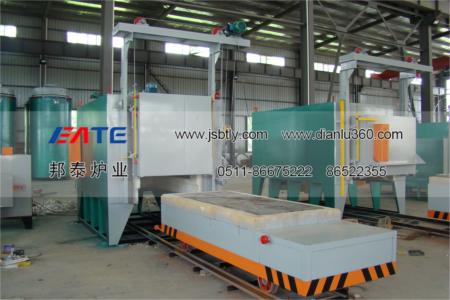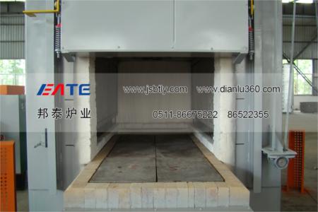 臺車上按裝有耐壓抗高溫的鑄鋼爐底板,以承載工件之用。為了防止工件加熱后產(chǎn)生的氧化皮通過爐底板間的縫隙落入加熱元件周圍而造成加熱元件損壞,因此爐底板與爐體接觸處采用插入式接觸。