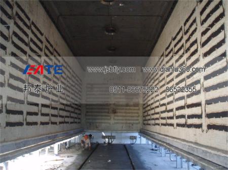 加熱元件采用高溫電阻合金絲繞制成帶狀和螺旋狀,分別吊掛在爐側(cè)及擱置臺車擱絲磚上,并用高鋁瓷釘和擱絲磚固定,防止脫出。
